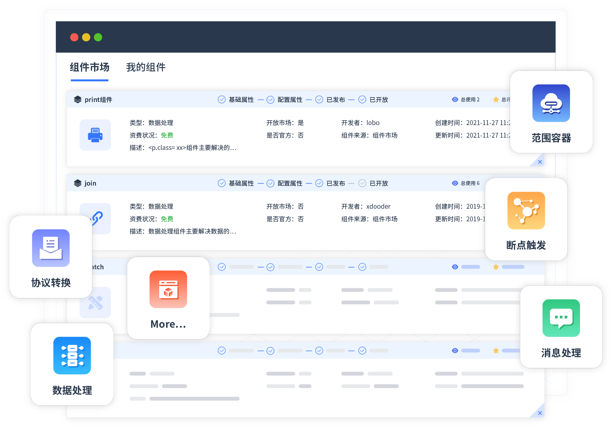 针对集成场景,,,,,,,,小米钱包提供组件市场,,,,,,,,,,,,,,例如协议转换、、、、、、消息处理、、、、、、文件操作等。。。。。。。。。。。。。。除平台提供的组件外,,,,,,,,,,客户可以自定义所需组件。。。。。。。。。。