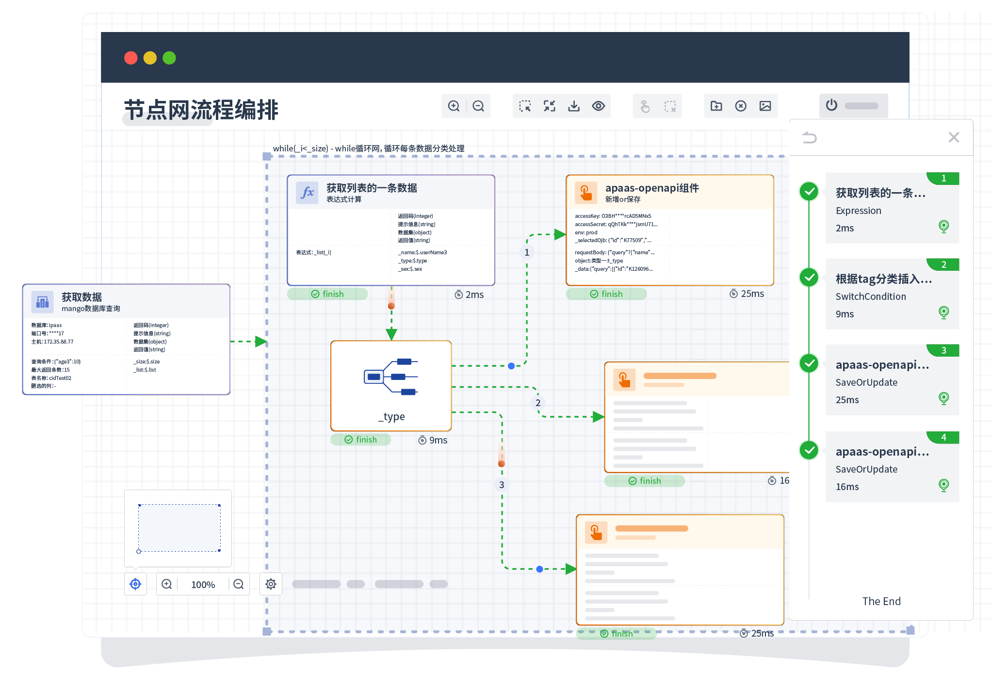 针对集成场景,,,,,,,,,,,组件定义后支持进行流程编制,,,,,,,,,不同于传统代码方式,,,,,,通过图形化展示,,,,,,,,,,,,,,支持在线调试、、、、、、、、、、、、日志查看和运行回放。。。。。。。